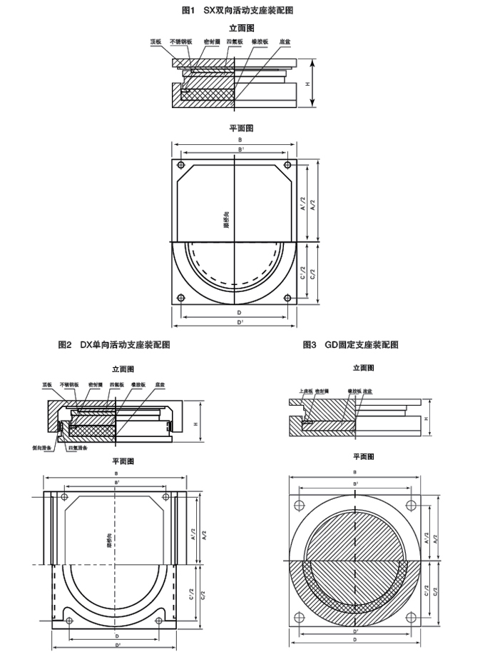 雙向(多向)活動(dòng)支座和單向活動(dòng)支座由上座板(包括頂板和不銹鋼滑板)、聚四氟乙烯滑板、中間鋼 板、密封圈、橡膠板、底盆、地細(xì)燦栓和防塵罩等組成,單項(xiàng)活動(dòng)支座沿活動(dòng)方向還設(shè)有導(dǎo)向擋塊。